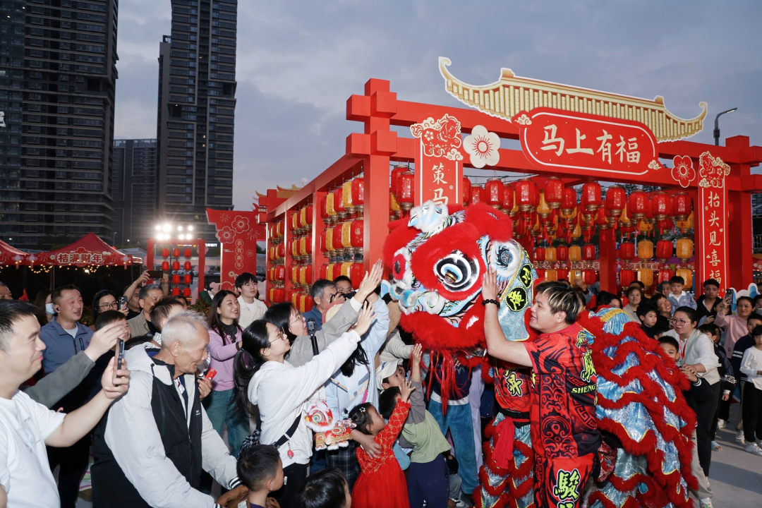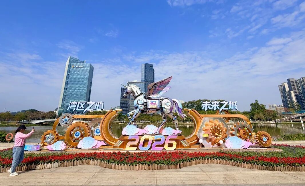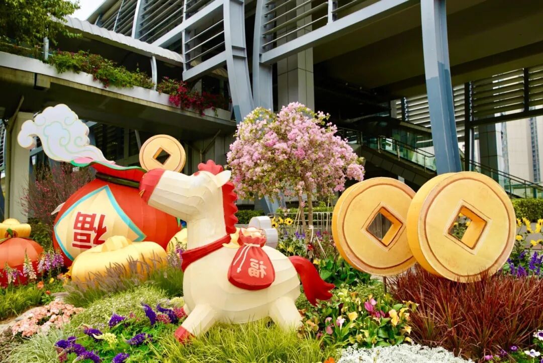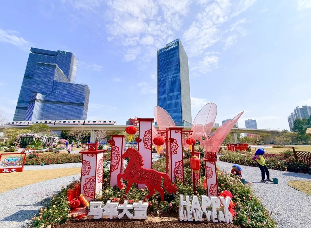 最吸睛确当属马年主题景不雅小品。造型灵动的骏马抬头奔腾,搭配南沙自贸区牌楼、盼望号、南沙区藏书楼等南沙地标剪影,以及祥云、红灯笼等吉利纹样,既有南沙范儿,又充满新年“好意头”。