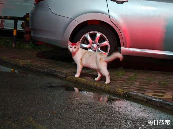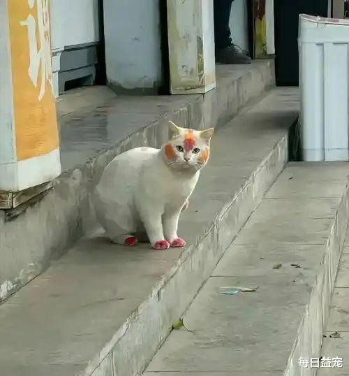一位女子在小区散播时,随机碰见了一只造型奇特的猫——它的头部和前爪王人被染上了不寻常的色彩,乍一看,真像是碰到了坏心对待。